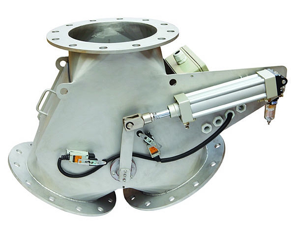 翻板式閥板,可帶料換向。結(jié)構(gòu)簡單,重量較輕,適合于安裝在輸送管線上。可氣動(dòng)或手動(dòng),帶閥板位置信號反饋,帶安全罩。